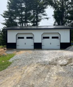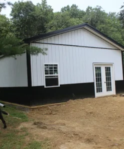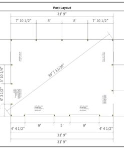 This complete kit includes all materials necessary to build a 24-foot by 32-foot pole barn with 10-foot wall height. It features treated 4×6 posts placed 8 feet on center, each set with a 5×12 precast concrete footer block and one 80-pound bag of Sakrete to ensure a secure, long-lasting foundation.