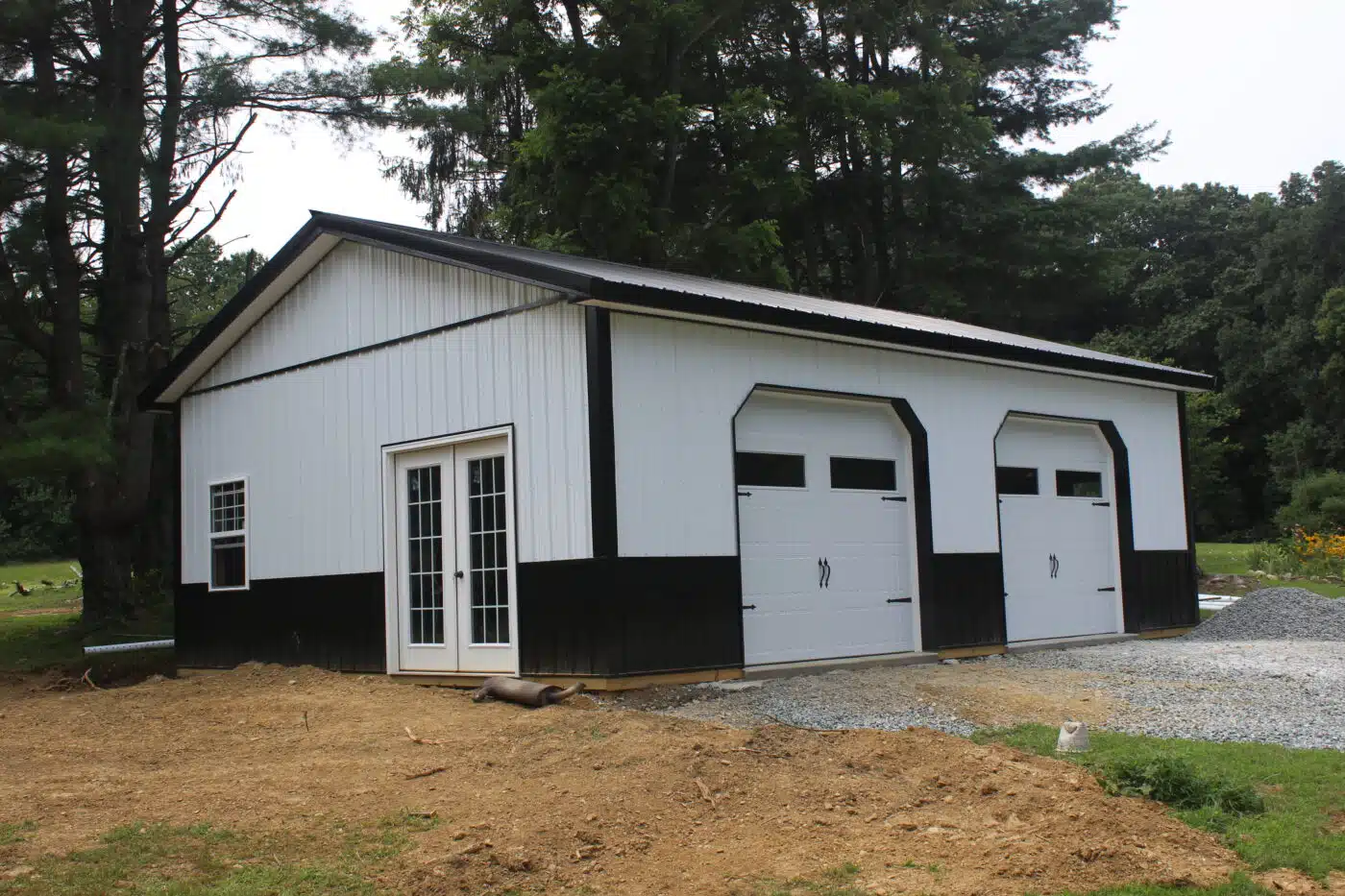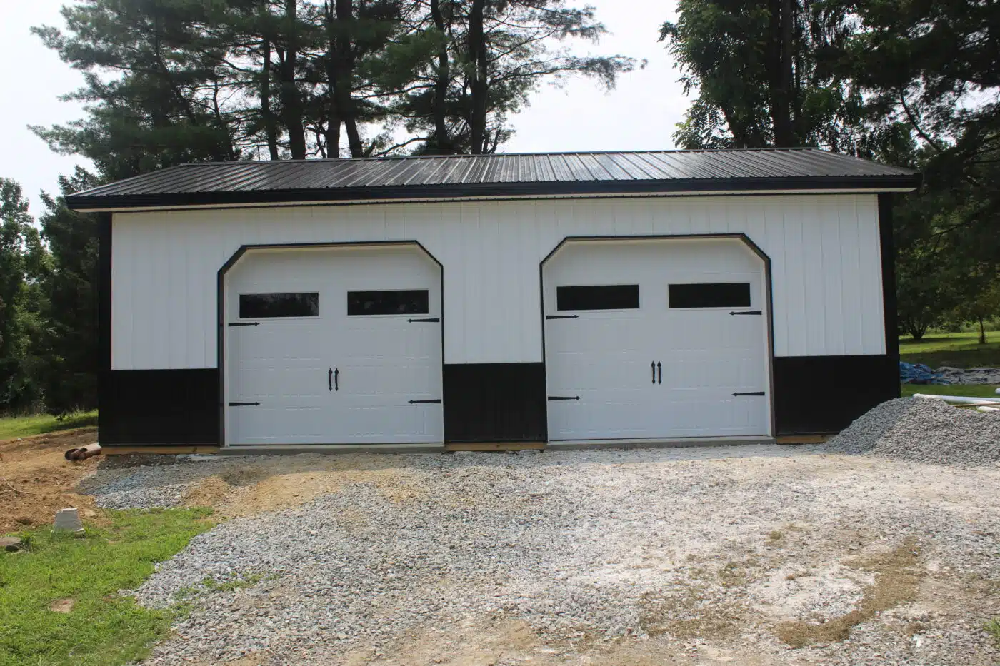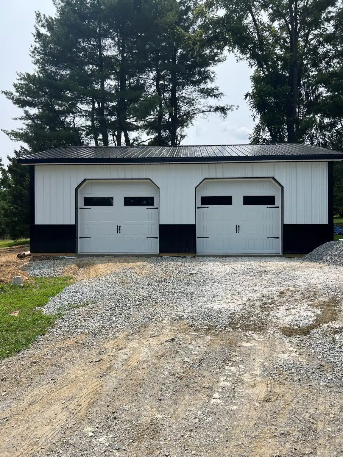 Both the eaves and gables feature 12-inch overhangs finished with vented metal soffit and painted steel fascia for proper ventilation and a clean, finished appearance. Wall framing includes 2×8 treated skirtboards and 2×4 purlins and girts spaced 24 inches on center for durability and support.