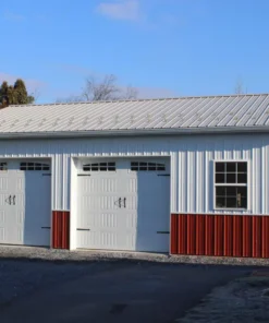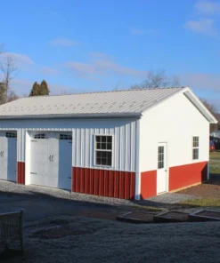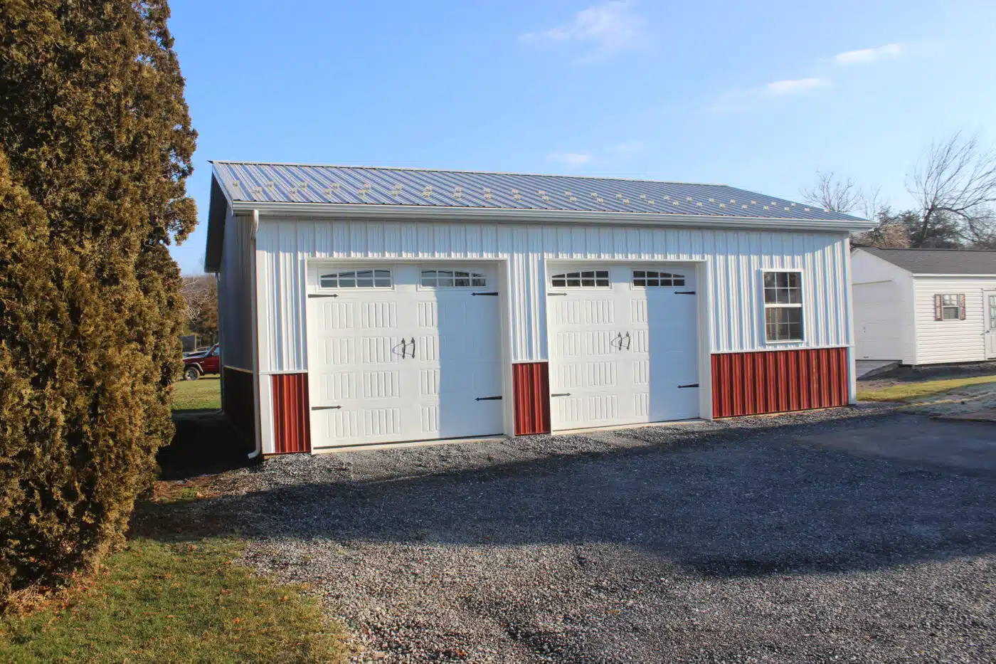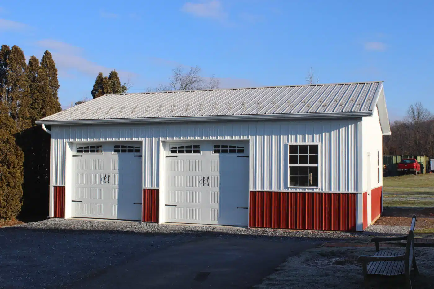 Vented closures under ridge cap, foam closure strips at eaves. Painted steel ridge cap, rake & corner trim, base angle, gutter apron, overhead door trim, double angle at gables. (2) ProDoor 4212 9’x8′ overhead doors, R-6.8 insulated, vinyl back, short carriage panel, white, torsion springs, standard track, weather stripping, slide lock, stockbridge garage windows, blue ridge decorative hinges & handles. (1) 3.0 x 6.8 9-lite, fiberglass entry door. (2) 36”x48” white, vinyl, single hung windows. 4” GRK structural screws for headers. Color matched screws for roofing & siding.