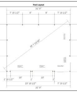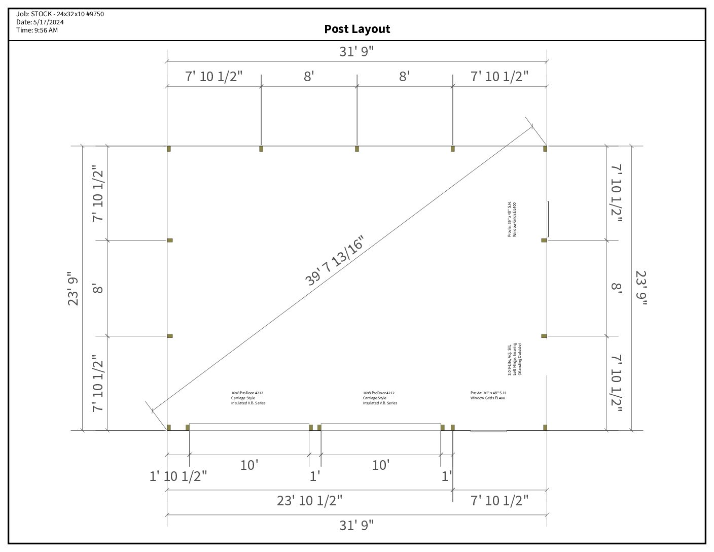 Material for 24’x32’x10’ pole barn: Treated 4×6 posts 8’ o/c. (1) 5×12 precast concrete footer block & (1) 80 lb bag sakrete per post. 2-ply 2×10 SYP headers (3-ply over 9’ eave openings). Pre-fabricated trusses with 4/12 roof pitch, 35-5-5 loading, 48″ on center. 12” overhangs on eaves and gables with vented metal soffit and painted steel fascia. 2×8 treated skirtboard. 2×4 purlins & girts 24” o/c. Everlast 28 Ga. LYNX Series metal roofing & siding. 3’-4” wainscot on all sides. Therma Guard R-9 vapor barrier on roof.