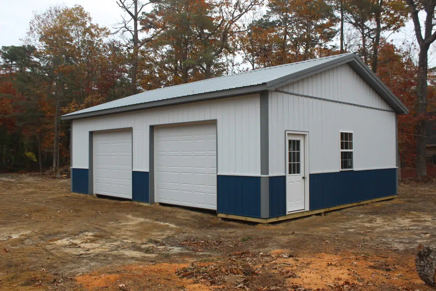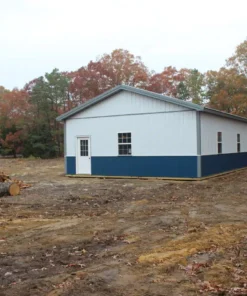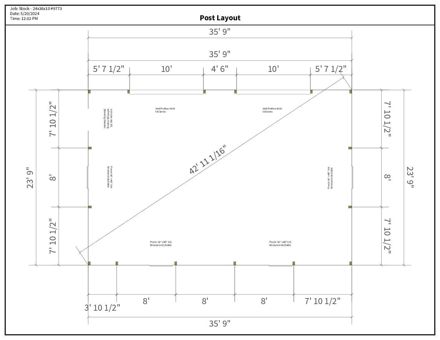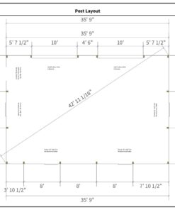 This materials-only kit includes everything you need to construct a 24-foot by 36-foot pole barn with a 10-foot wall height. The structure is framed with treated 4×6 posts placed 8 feet on center. Each post is anchored with a 5×12 precast concrete footer block and one 80-pound bag of Sakrete for a stable and secure foundation.