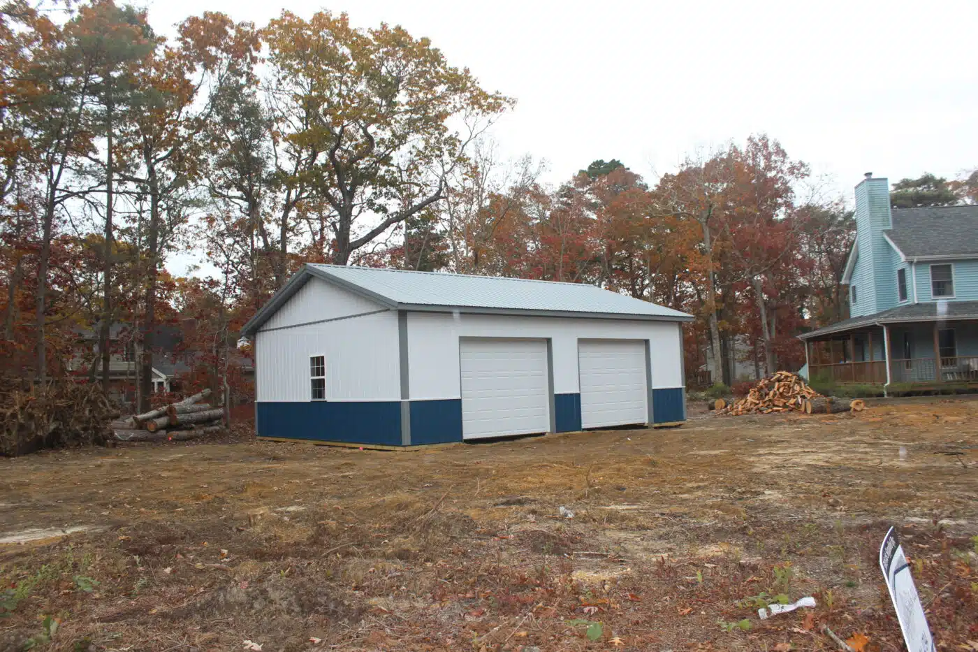To enhance the building’s durability and ventilation, the design includes 12-inch overhangs on both eaves and gables, finished with vented aluminum soffit and painted steel fascia. Wall framing includes 2×8 treated skirtboards and 2×4 purlins and girts spaced 24 inches on center.