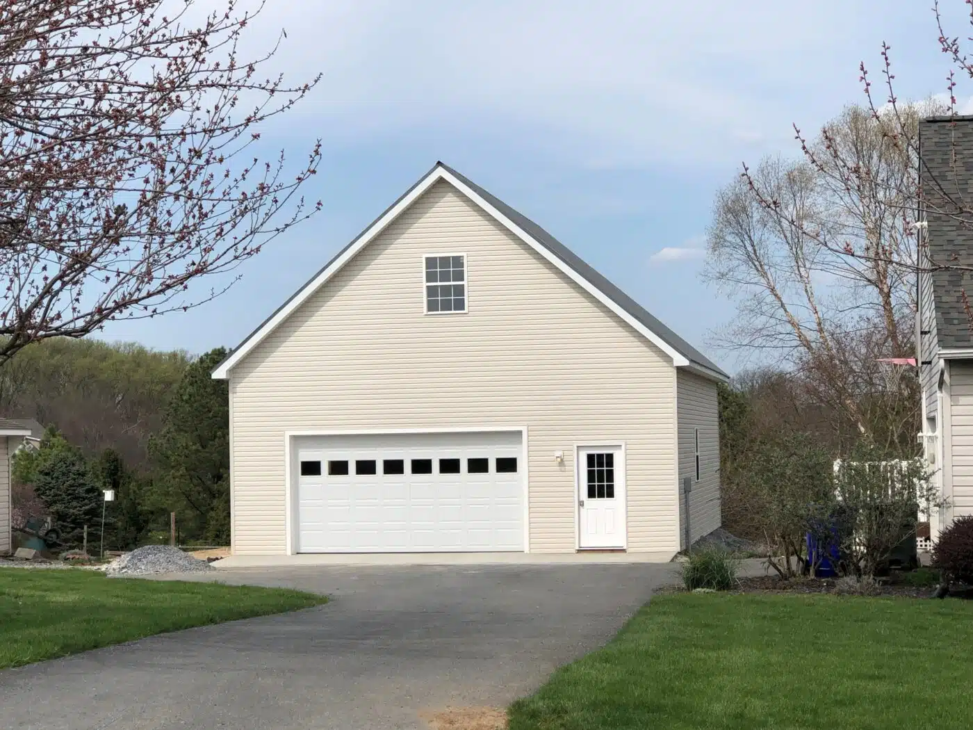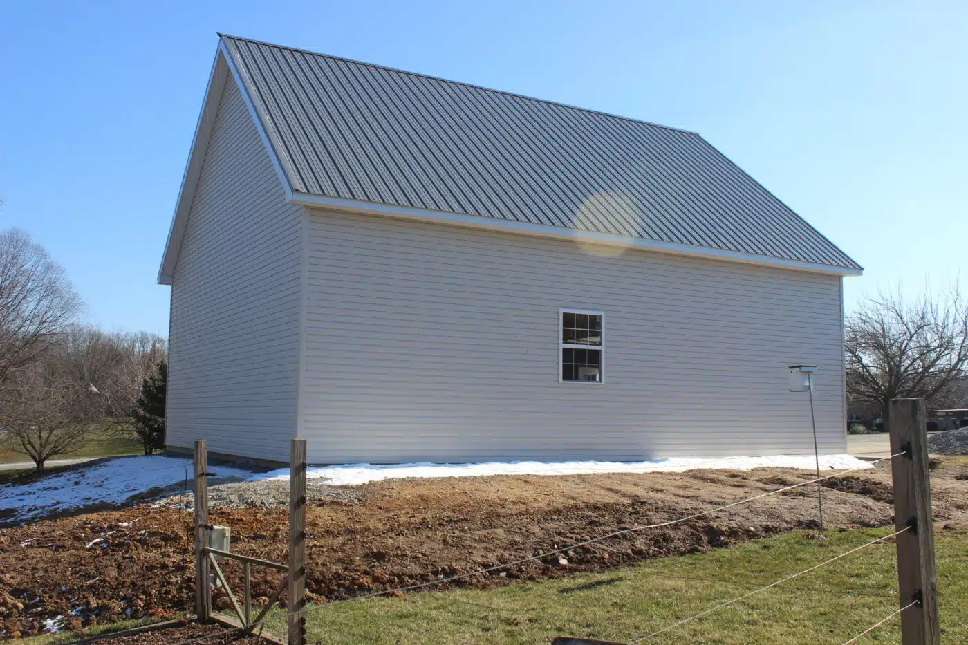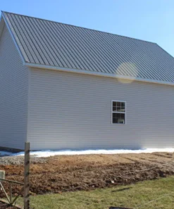 The building is finished with CertainTeed American Legend Double-4 vinyl siding in a standard color for a clean and durable exterior appearance. All trim elements are color-matched painted steel, including ridge cap, rake trim, and gutter apron.