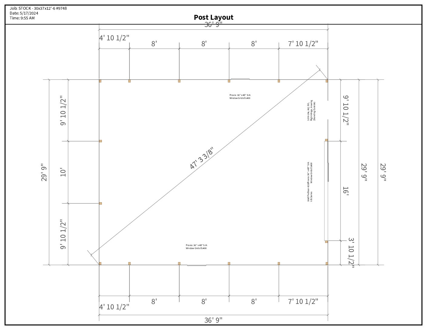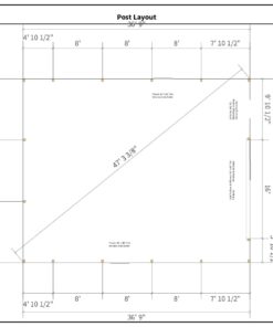This materials package includes everything needed to construct a 30-foot by 37-foot pole barn with a wall height of 12 feet 6 inches and an integrated attic room. The structure is built using 3-ply 2×6 glue-laminated posts, each anchored with a 5×16 precast concrete footer block and one 80-pound bag of Sakrete for long-lasting support.