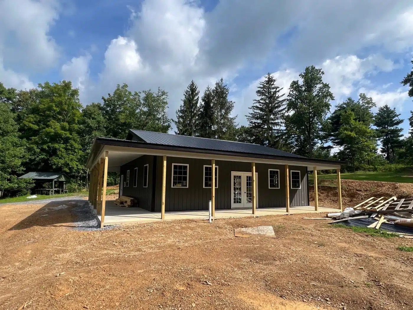 2×4 purlins & sidewall girts 24″ on/center. Everlast 28 gauge LYNX Series metal roofing. 1×12 Eastern White Pine Board & Batten siding. (2) 10′ x 9′ ProDoor 6410 OHD With One Row of Windows, R-10 Insulated With 26ga. Steel Back, Raised Panel Wood Grain, White, Torsion Springs, Standard Track, Weather Stripping, Steel Angle, Slide Lock. (1) 3.0 x 6.8 9 Lite, fiberglass entry door with black, keyed entry door knob. (7) 36”x48” white, vinyl, single hung windows with grids. 4” GRK structural screws for headers, color matched screws for roofing.